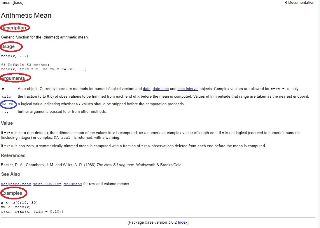 Upon further inspection, however, we see something else: The mean() function needs more information. In particular, we have to specify how R should deal with missing values, here NAs (see the section circled in red). This wasn’t a problem in the first example (since we had no NAs), but seems to be a problem for the second example. The manual reads as follows: