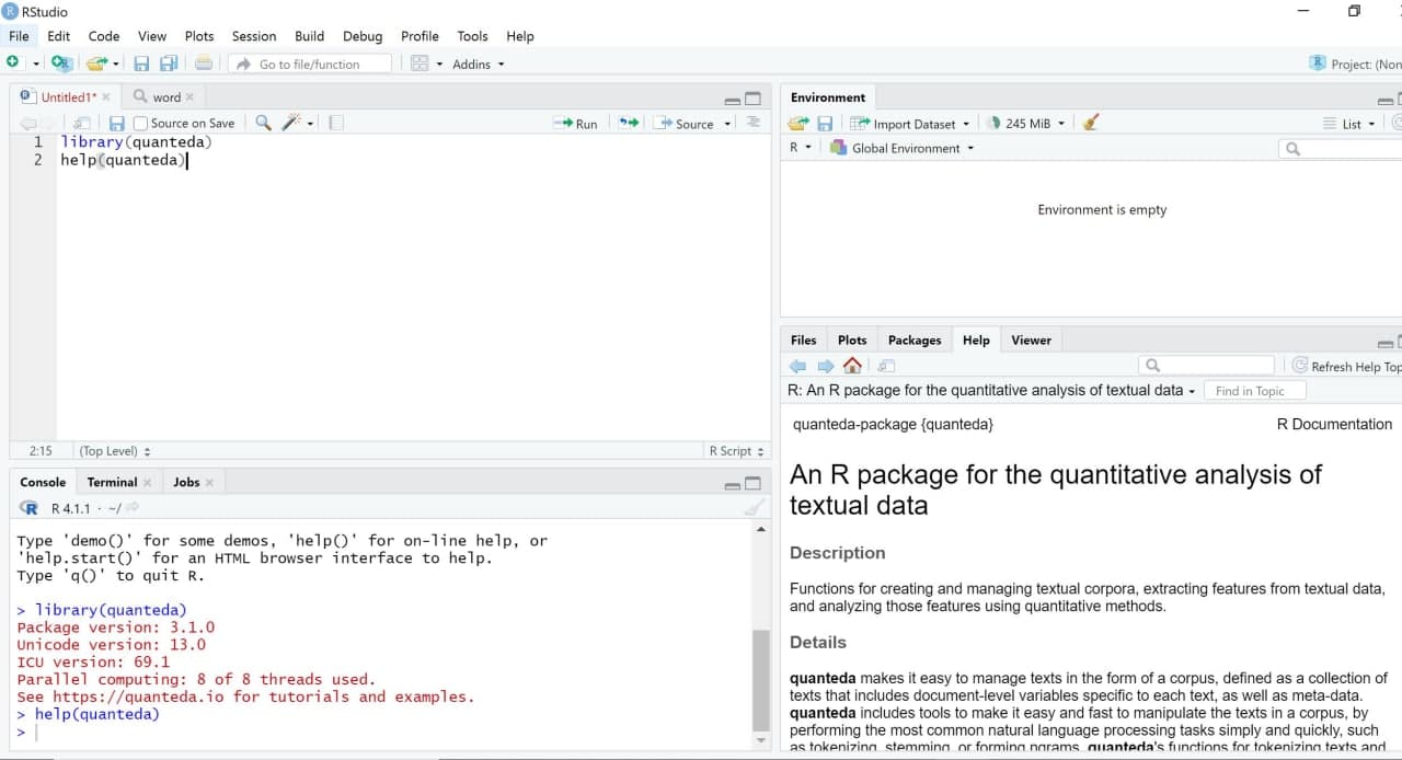 This is where our fourth window comes into place as results for our search for help are depicted here (the paragraph depicted here is the reference manual including information on the mean() function).