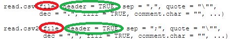 However, arguments were are default value is given can be ignored. If you do not specify values for these arguments yourself, R will simply take the default value. For instance, the read.csv2() function will automatically use the first row of a CSV file as column names, unless you actively set the argument header to FALSE.